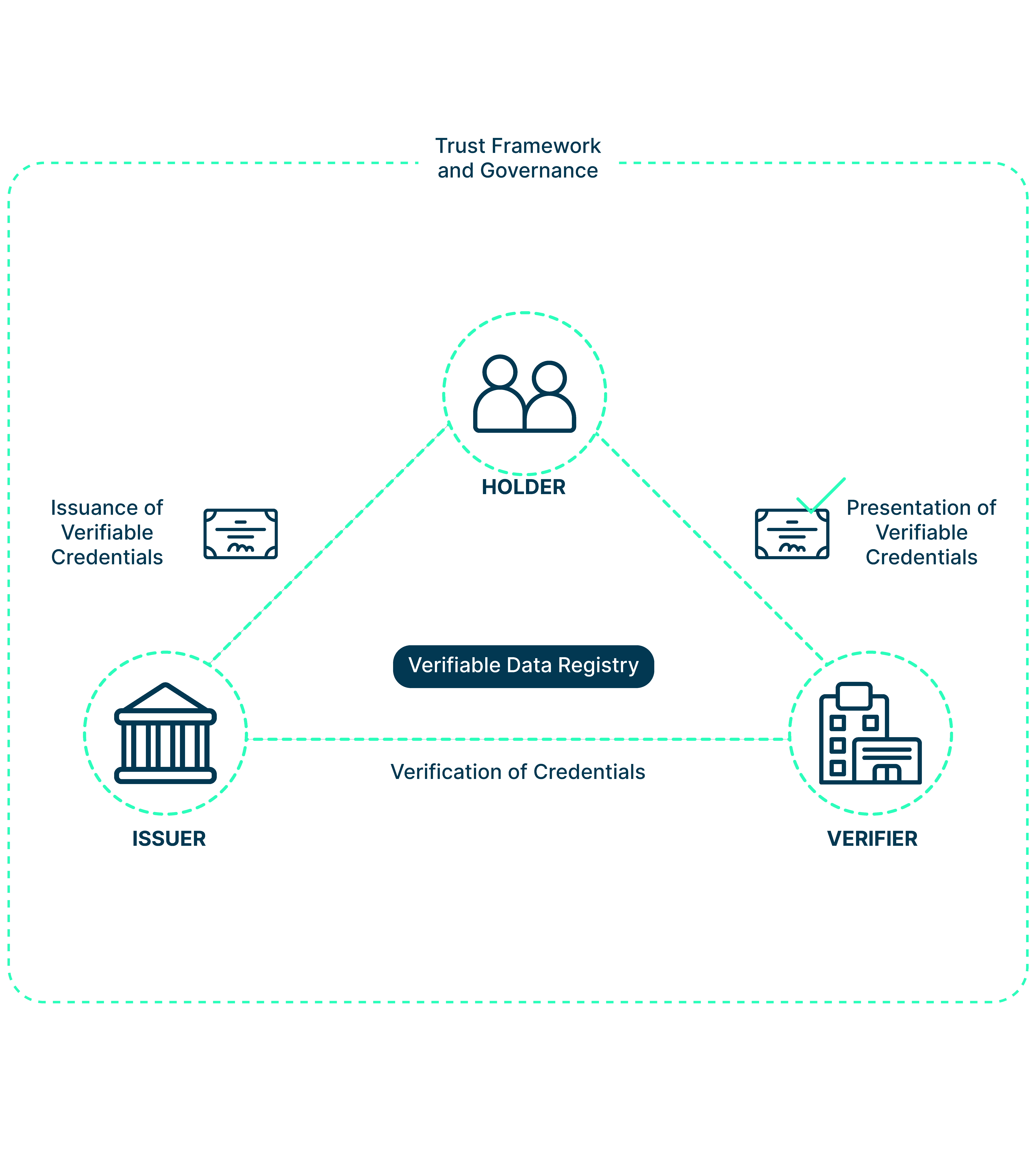 Digital Identity centers on three key actors: issuer, holder, and verifier, forming the Trust Triangle.